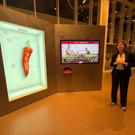 Na de boeiende presentatie van Anneke van de Kamp kregen we een rondleiding door zowel het logistieke deel als het interactieve gedeelte van het centrum. Daar ontdekten we stap voor stap het proces achter de optimalisatie van een nieuw ras van de zoete puntpaprika. In slechts een paar minuten “reisden” we maar liefst 16 jaar vooruit door alle fasen van veredeling heen — een indrukwekkende inkijk in de complexiteit en precisie van het vak.